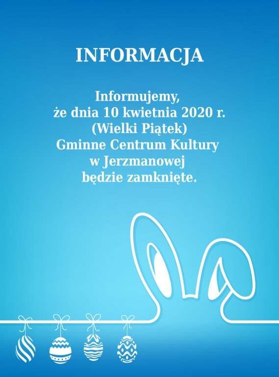 [więcej...]Informujemy, że dnia 10 kwietnia 2020 r. (Wielki Piątek) Gminne Centrum Kultury w Jerzmanowej będzie zamknięte.