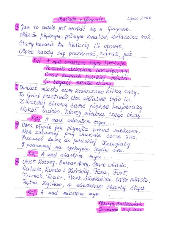[więcej...]Z cyklu Jerzmanowskie prezentacje artystyczne, przedstawiamy „Balladę o Głogowie” napisaną przez mieszkańca Jerzmanowej pana Henryka Bartkowiaka. Liczymy, że w przyszłości powstanie ballada o Jerzmanowej.