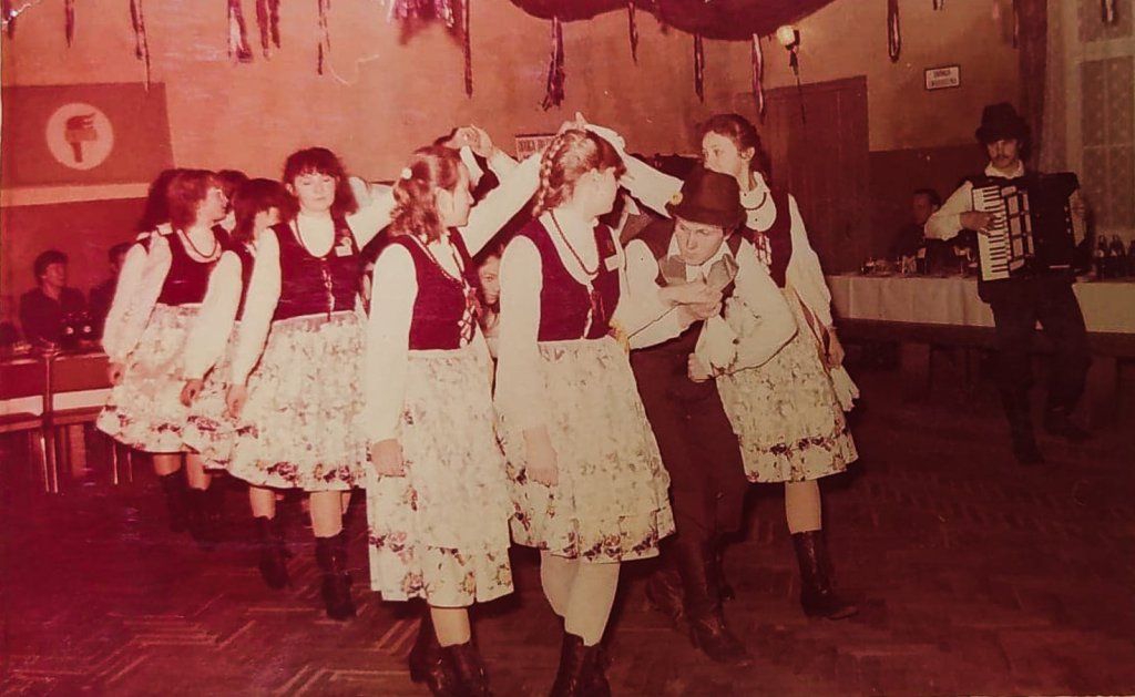 „Młodzież z zespołu podczas I Spotkania pokoleń zespołów folklorystycznych we wsi Jaczów.” - 25 stycznia 1987r., Jaczów