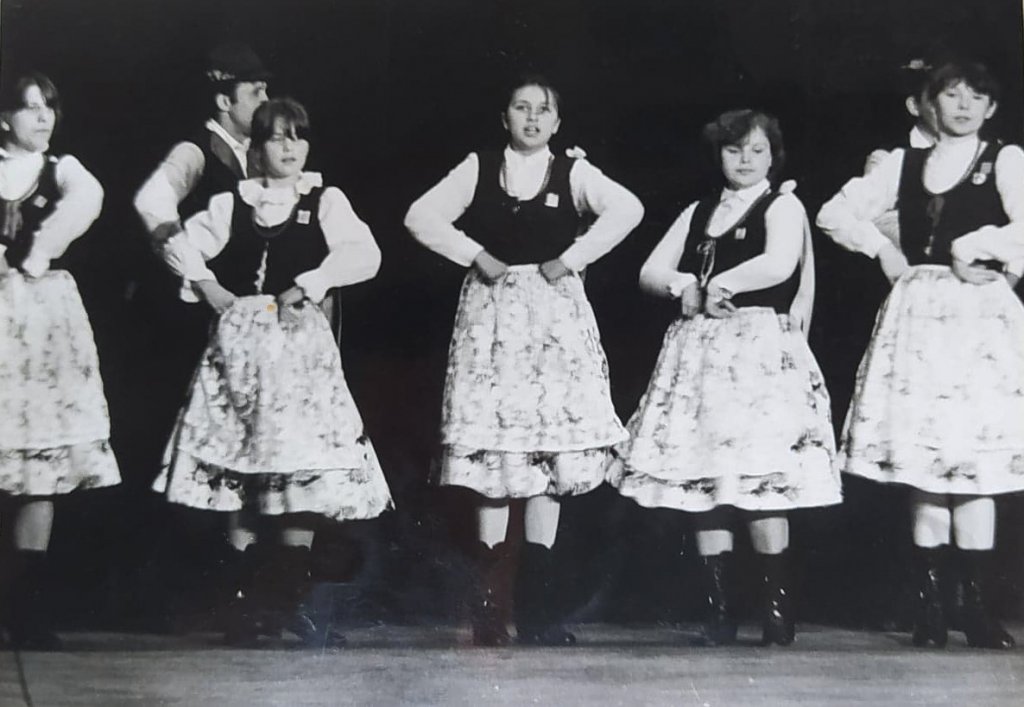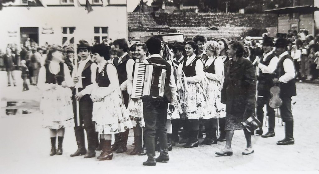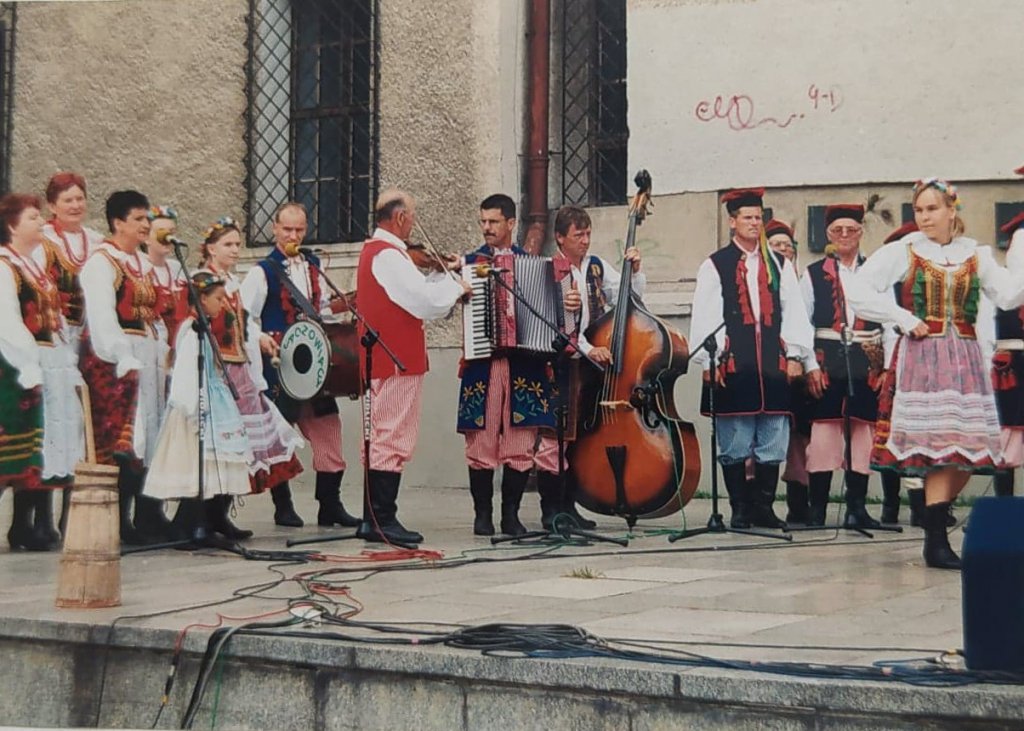 „Członkowie zespołu podczas występów na IV Spotkaniu Zespołów Folklorystycznych woj. Legnickiego w Złotoryi.” Złotoryja, 22-23 czerwca 1985r.