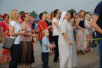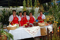 Ale zatrzymajmy się jeszcze przy Smakach Lata. Do tego zadania sołectwa przygotowały się perfekcyjnie. Na poczęstunek zapraszały nie tylko słowem. Zachętą były także zagrody, a w nich drewniane płoty, stare garnki, ozdoby z liści, kwiatów, kukurydzy, zwierzęta i … oczywiście stoły suto przygotowane dla gości. Za symboliczną „złotówkę”, zbieraną dla pielgrzymów, można było zjeść gołąbki, pierogi ruskie i z jagodami, leczo, bigos czy pajdę chleba ze smalcem i ogórkiem. I mnóstwo ciasta