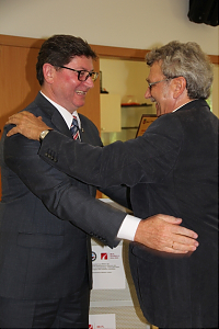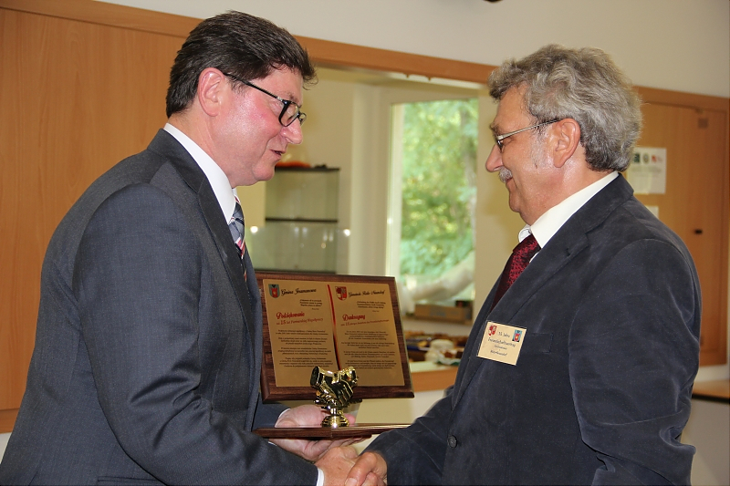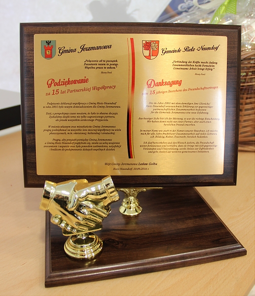 z wymownym gestem uścisku dłoni oraz odczytany przez niego grawer wywołały burzę oklasków wśród niemieckiej publiczności, którą stanowili najważniejsze osoby w gminie, urzędnicy oraz osoby zasłużone w 15 letniej historii współpracy.