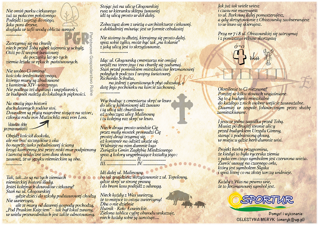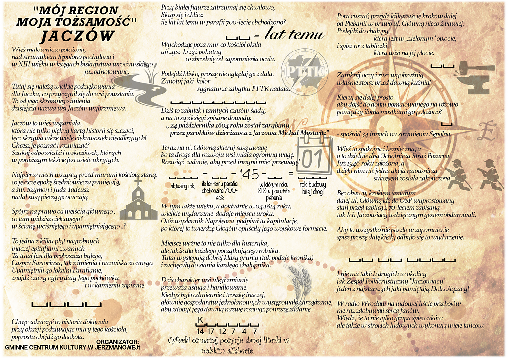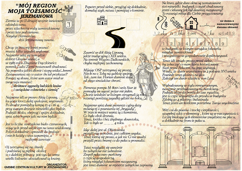 w podchody. Poniżej zamieszczamy mapki, które zaprowadzą ciekawskich do miejsc godnych zobaczenia w dwóch największych miejscowościach gminy Jerzmanowa: w Jerzmanowej i w Jaczowie. Mapki są tak skonstruowane, że spacerowicz musi trochę pogłówkować by rozwiązać rebusy, odgadnąć zagadki i przede wszystkim odwiedzić miejsca wskazane przez autora mapek.