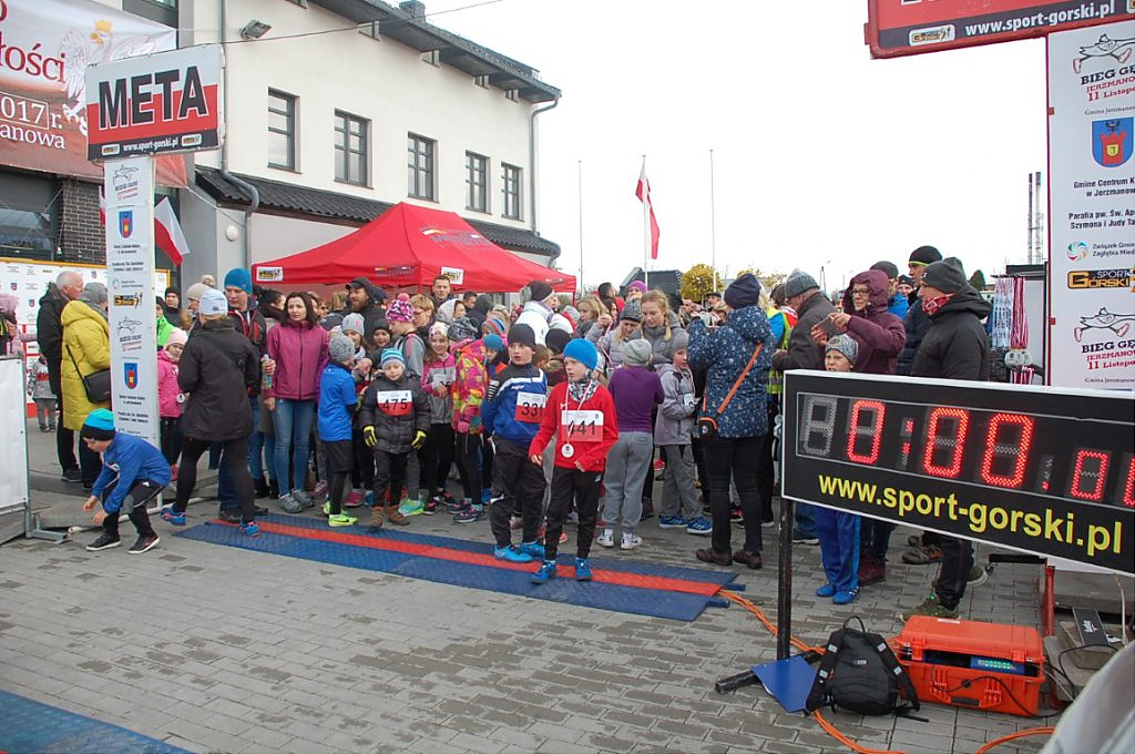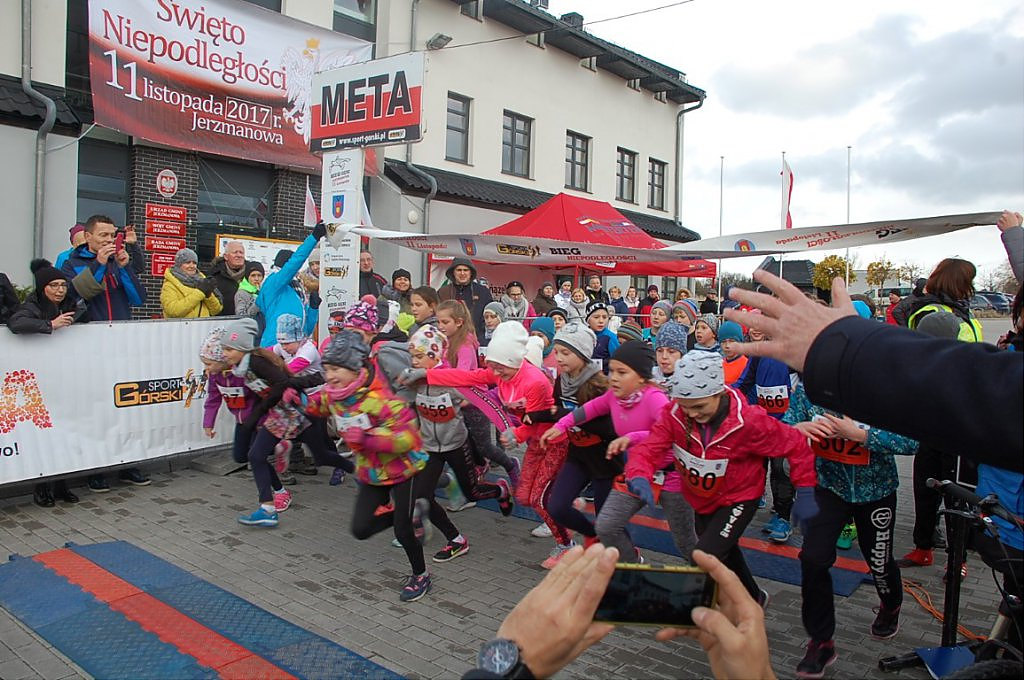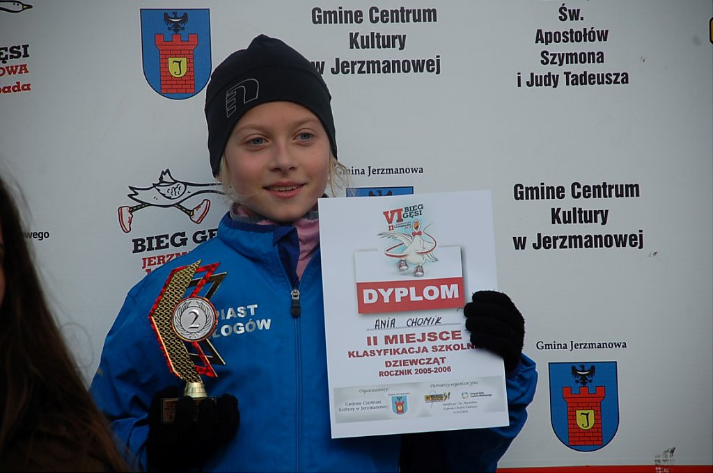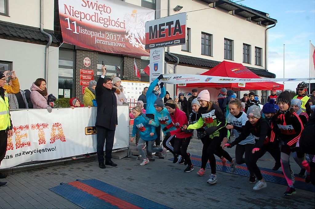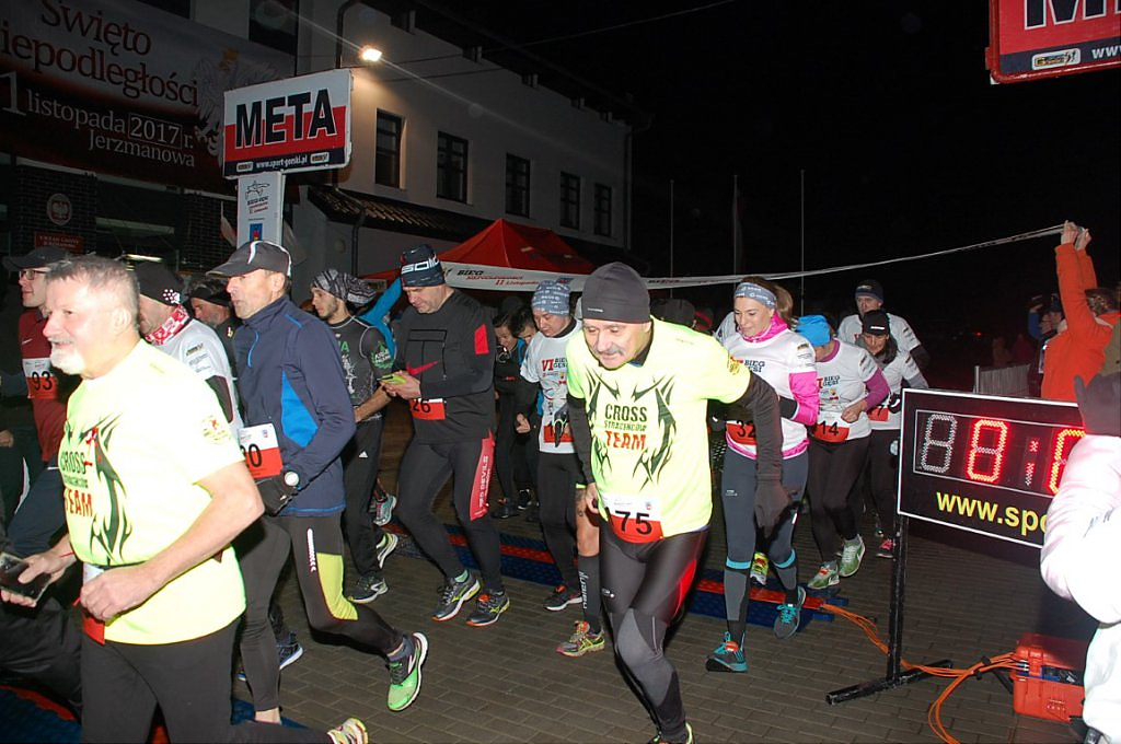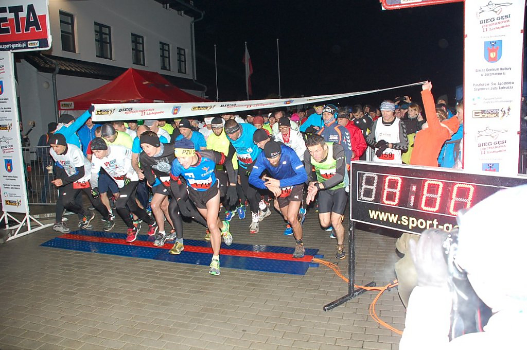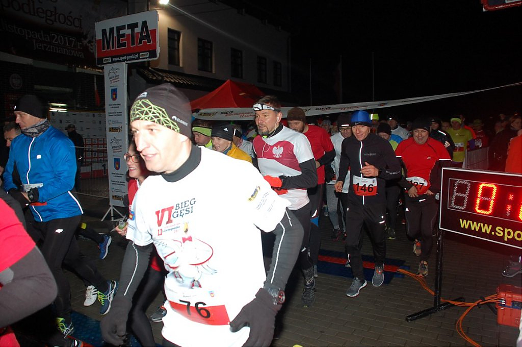 Atrakcje zakończył Patriotyczny Łańcuch Ognia z pochodniami, którymi kibice oświetlili trasę VI Biegu Gęsi, najważniejszego wydarzenia sportowego w okolicy. Równo o godz. 17:00, na sygnał startera (L. Golba) wybiegło na trasę, liczącą 8 km, 186 biegaczy. Pierwszy na metę przybiegł Sebastian Sobczak z Nowej Soli z czasem 26 min. 51 sek. W kategorii kobiet zwyciężyła Anna Ficner z Wilkowa. Niespodziankę, którą skrzętnie ukrywali organizatorzy przed zawodnikami aż do startu była osobna klasyfikacja o nazwie: „Mistrzostwa gminy Jerzmanowa”. Po raz pierwszy w historii Biegu Gęsi osobno klasyfikowani byli mieszkańcy i mieszkanki gminy. W kategorii tej nagrody otrzymali: Grzegorz Jankowski (Jaczów), Mariusz Polasik (Gaiki) oraz Ewa Paduch (Jerzmanowa). Jak zapewniali zawodnicy na Biegu Gęsi trzeba być, posmakować gęsiny i poczuć atmosferę listopadowego, wieczornego biegu. Organizator tradycyjnie zadbał o poczęstunek dla zawodników, tym razem był to gulasz z gęsich żołądków serwowany przez Kulinarny Teatr z Łodzi. Gulasz gotowany był przez cały czas trwania imprezy, na ogromnej patelni, a szef kuchni Krzysztof Górski mieszając go żartował, że jest to najbardziej patriotyczna potrawa, ponieważ są w niej biała cebula i czerwone pomidory, białe pieczarki i czerwona papryka, a do tego gęsina na św. Marcina.