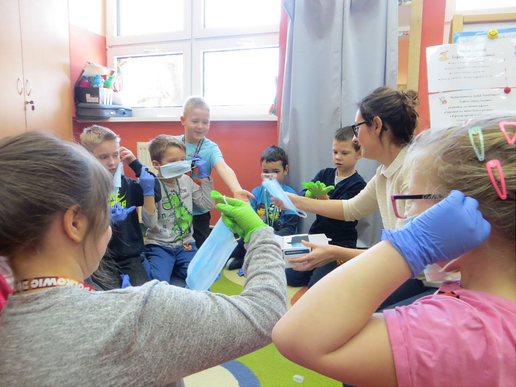 Na koniec zajęć, każdy z maluchów mógł poczuć się jak dentysta, ponieważ wszystkie dzieci w prezencie otrzymały: maskę na twarz, rękawiczki, szczoteczki, którymi ćwiczyły ząbkowanie oraz lusterka dentystyczne do jamy ustnej. Sprawiło to wszystkim uczestniczącym niesamowitą radość!