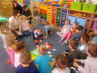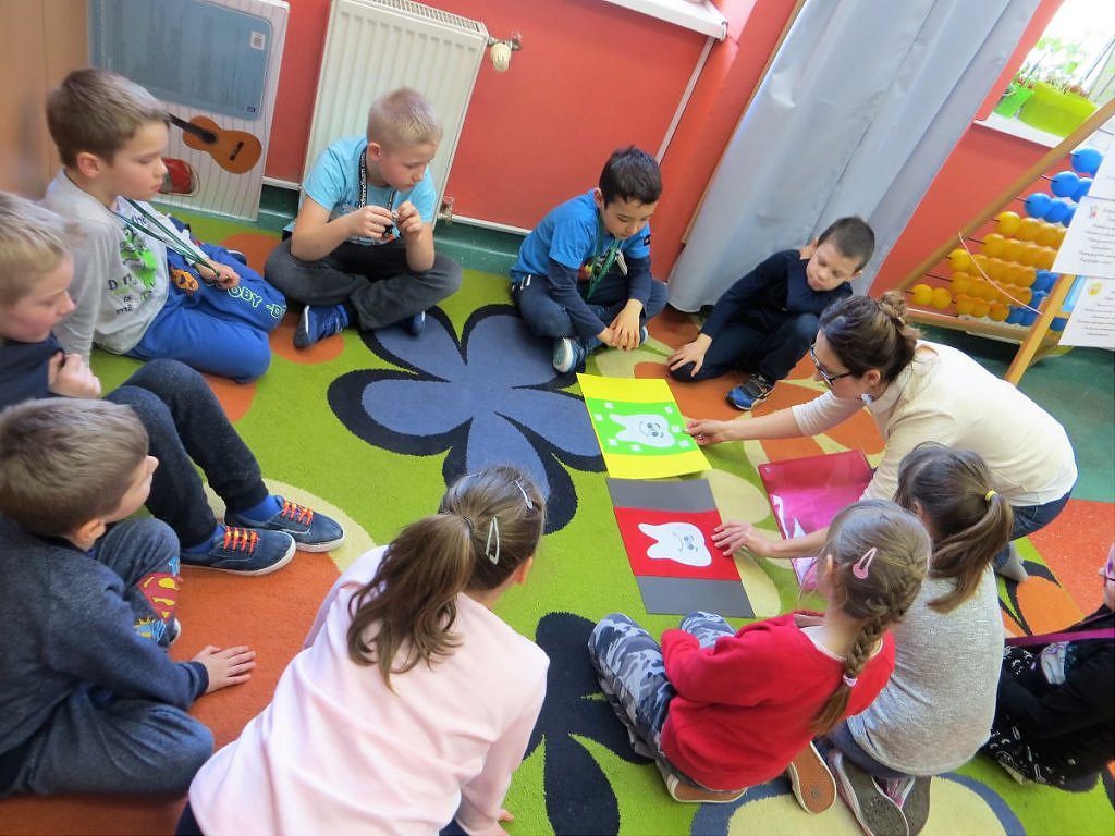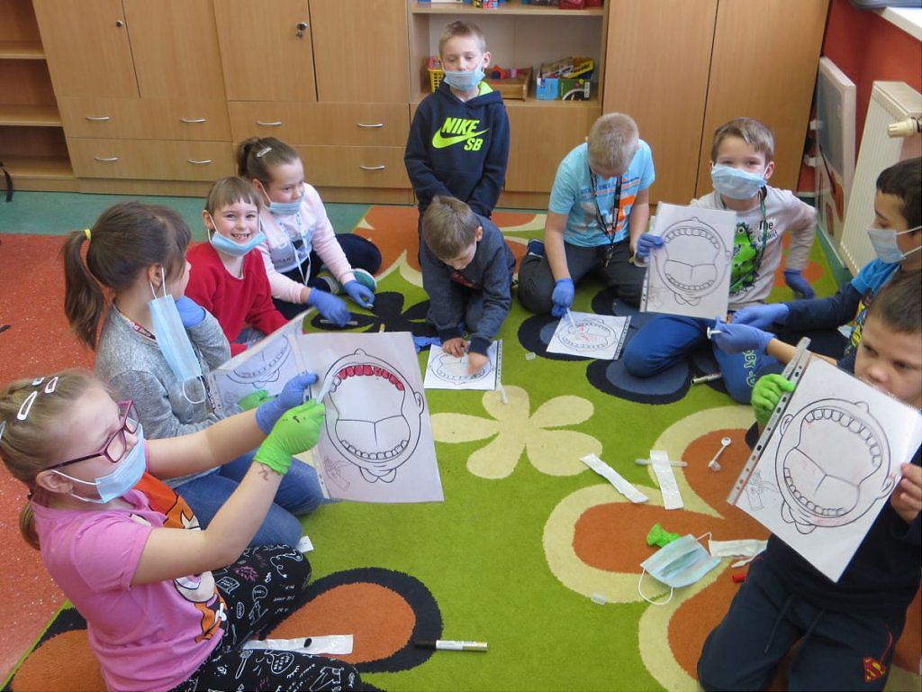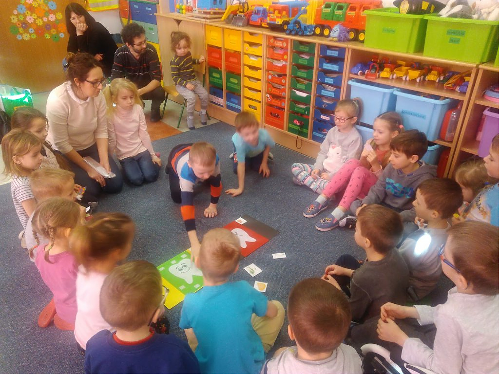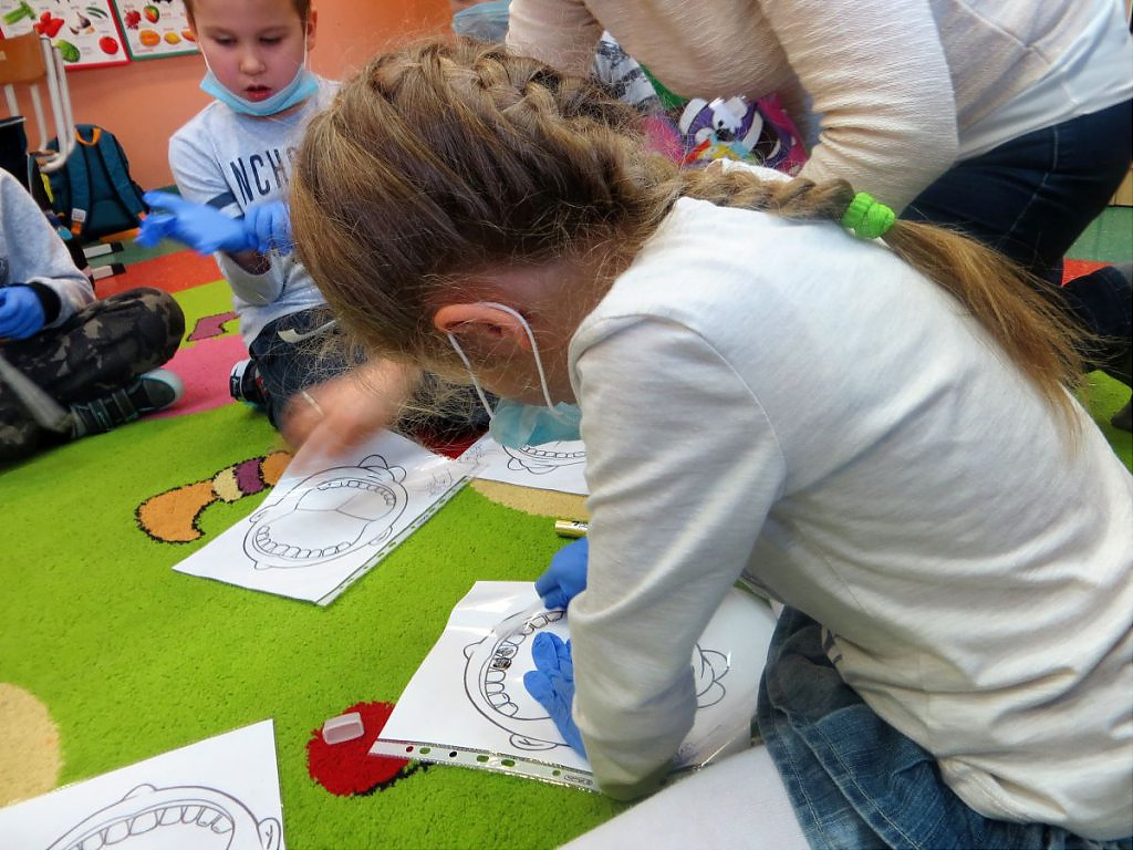 Pani Bernarda na początek zajęć, przedstawiła w teatrzyku Kamishibai historię Zuzi, która miała robaki w zębach i musiała pójść do dentysty. Dzieci z zainteresowaniem słuchały bajki i chętnie po skończeniu historii rozmawiały na jej temat, jak również same zadawały pytania i dzieliły się swoją wiedzą na temat tego, co dla ząbków jest zdrowe, a co nie. Pomogła im w tym zabawa z Panią Bernardą, przypominająca jakie produkty warto jeść , a jakich najlepiej unikać. Dzieci również manualnie ćwiczyły szczotkowanie zębów, na modelach wykonanych z modeliny. Każde dziecko dostało szczoteczkę i model ząbków i mogło poćwiczyć odpowiednie mycie ząbków, jak również dowiedziały się, jak oczyszcza się język. Dzieci bardzo chętnie brały udział w tych wszystkich zabawach i widać było, że jest to temat, który ich bardzo interesuje. Z chęcią opowiadały własne przygody z ząbkami.
