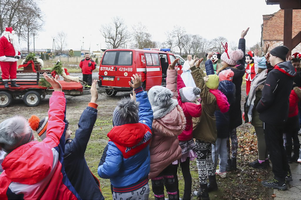 „W niedzielę w godz. 12:30 – 20:00 po drogach gminy Jerzmanowa poruszał się dziwny pojazd. Były to dzwoniące sanie zaprzężone w wóz strażacki, a na nich siedział tęgawy jegomość z białą, długą brodą i w czerwonym stroju. Niestrudzenie machał dzwonkiem i wiózł skrzynię pełną prezentów. Ze skrzyni wystawała także rózga. Czy wiecie kogo ścigał jadący za nim i migający światełkami pojazd i kto nim kierował? Prosimy o podanie szczegółowych informacji.”