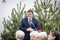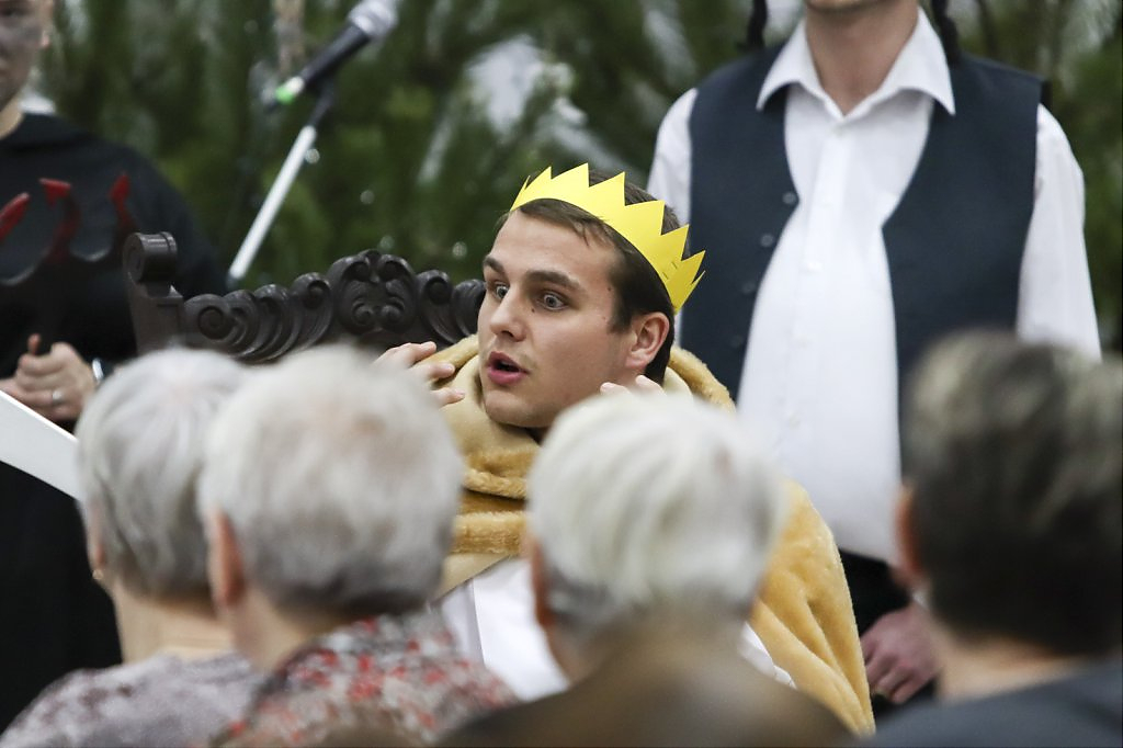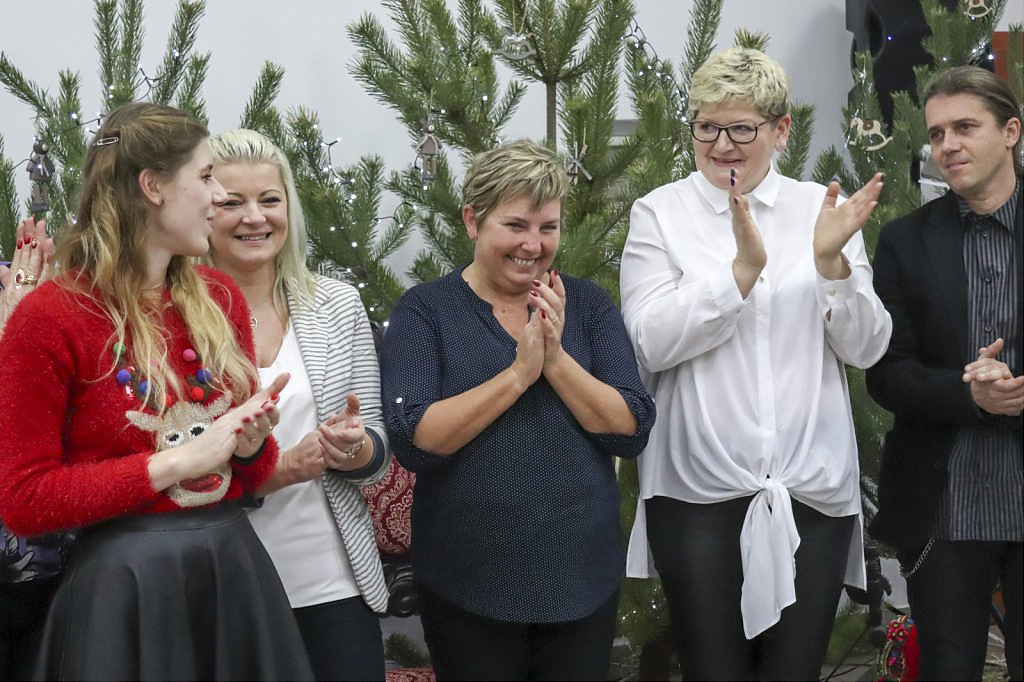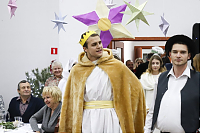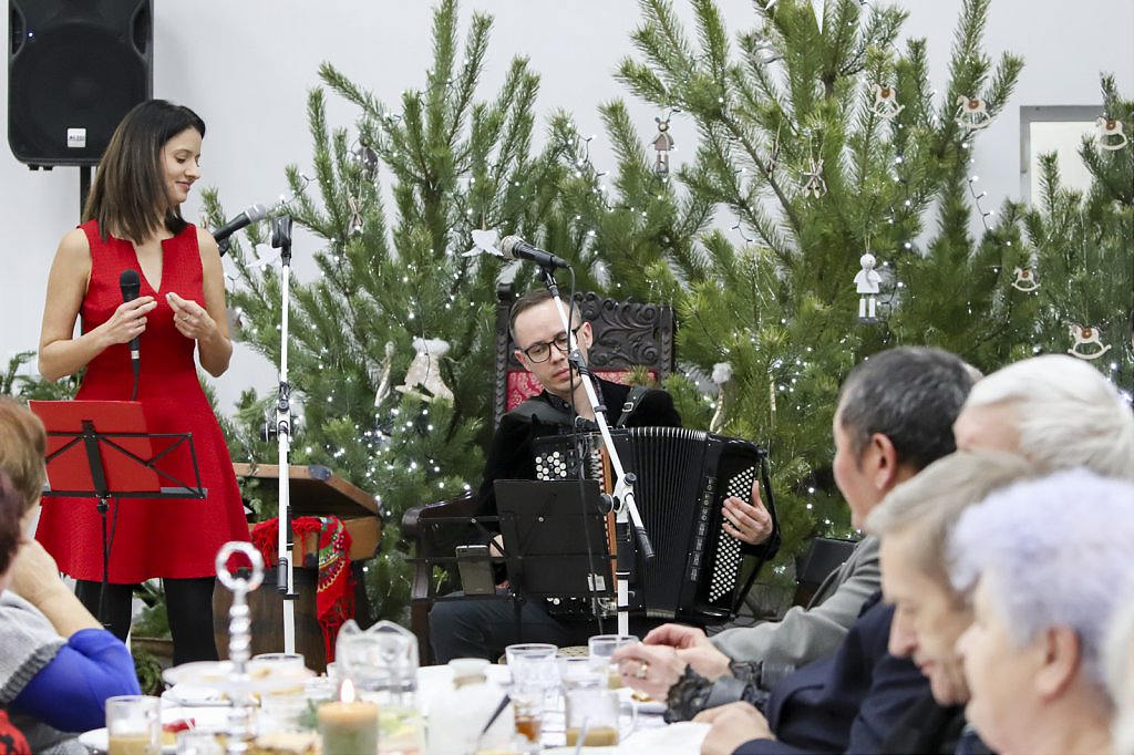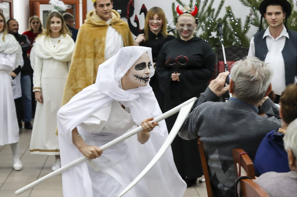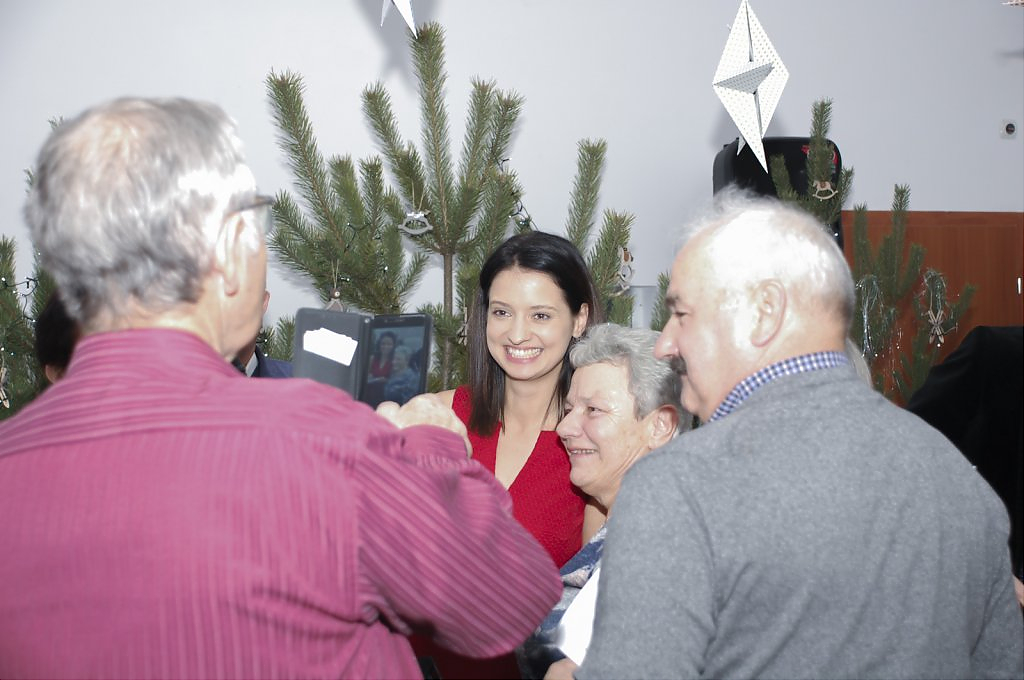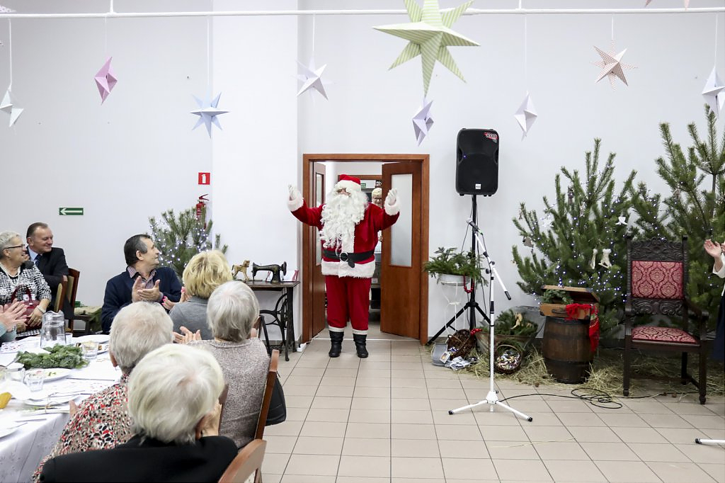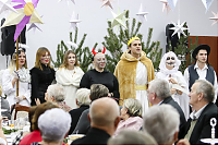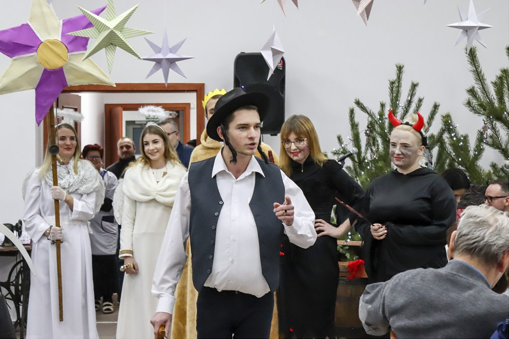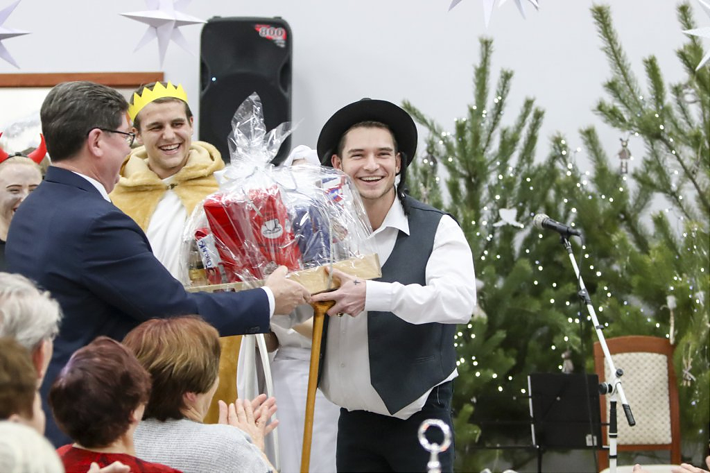 Sięgając do pamięci dzieciństwa wielu seniorów wspominało zwyczaj odwiedzin kolędników. I tym razem tradycji stało się zadość i przed seniorami wystąpili kolędnicy, a wśród nich król Herod, diabły, śmierć, aniołki. Swoim żywiołowym występem wprowadzili wiele hałasu ale i radość, którą okazali poprzez gromkie brawa. W świąteczny nastrój wprowadziły wszystkich kolędy w wykonaniu krakowskiej grupy z utalentowaną wokalistką Anną Kukawską. Dla sympatyków aktorskiego kunsztu p. Ani i roli w serialu „Policjanci i policjantki” jej występ był wspaniałą niespodzianką oraz możliwością otrzymania autografu i wykonania wspólnego zdjęcia.