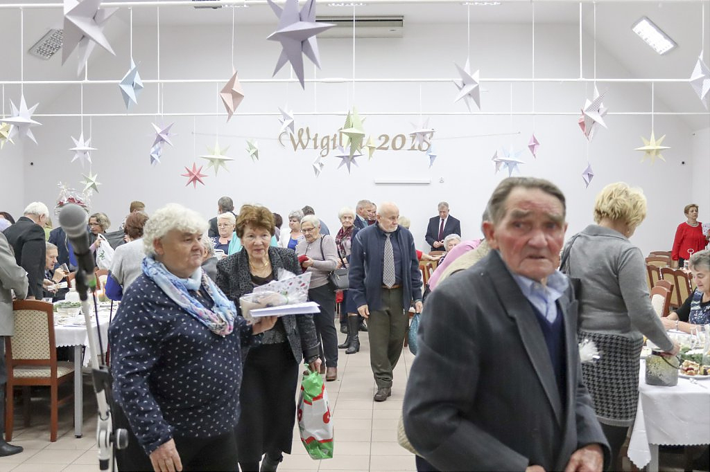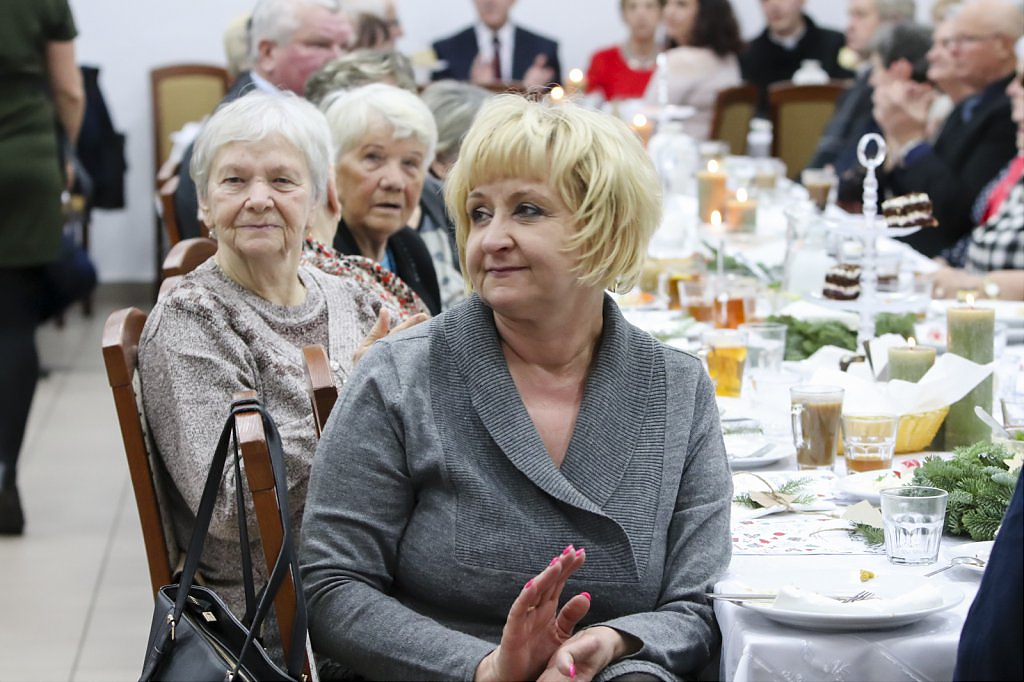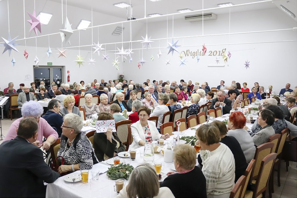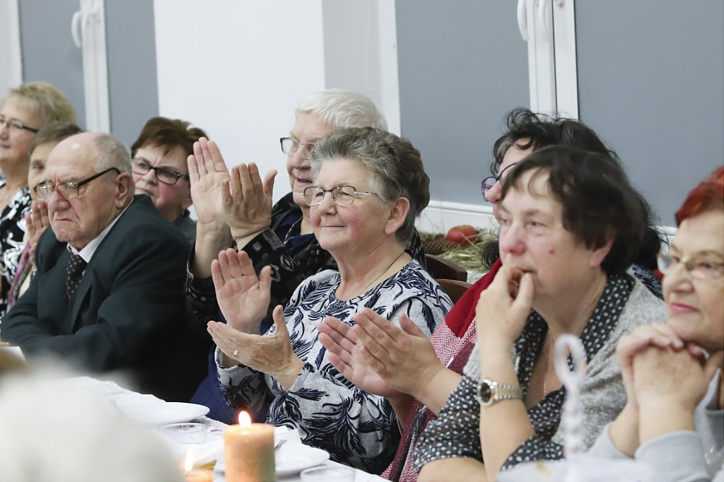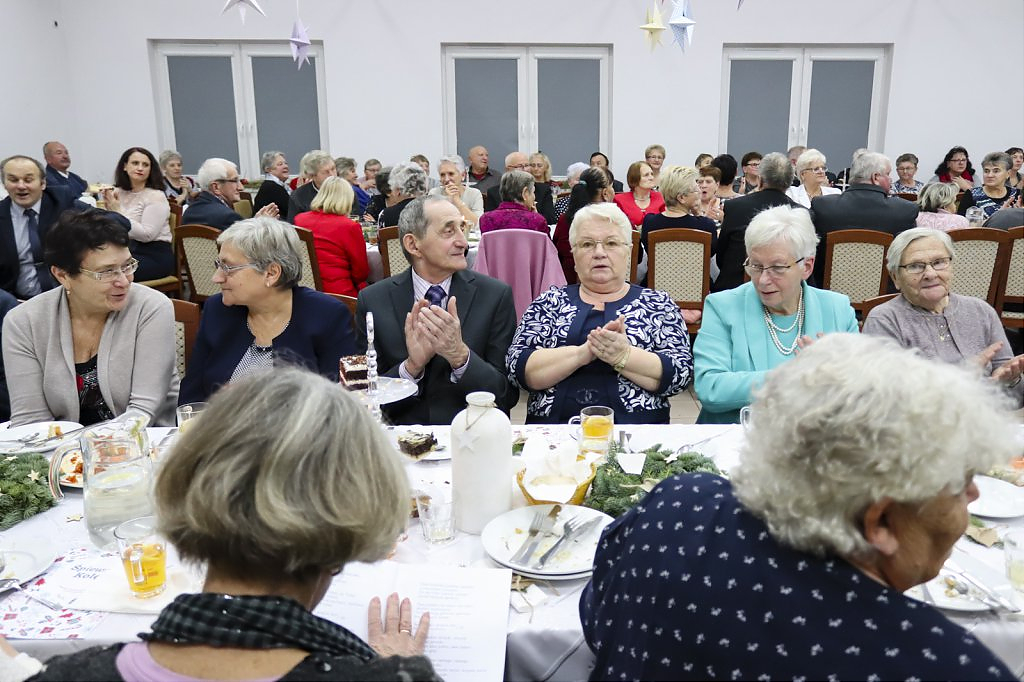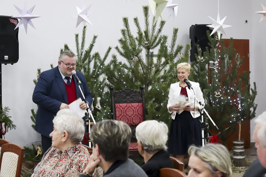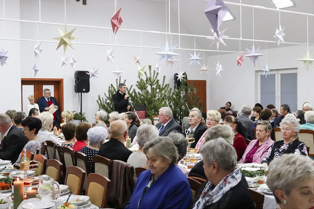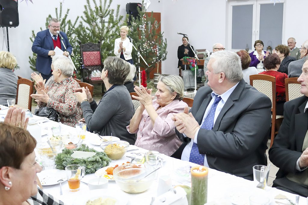 Jak tradycja karze spotkanie przy wigilijnym stole rozpoczęto odczytaniem fragmentu Ewangelii św. Łukasza o narodzeniu Chrystusa i krótkim przesłaniem ks. Piotra Matusa o wielkim cudzie danym każdemu człowiekowi tj. możliwości wewnętrznego odrodzenia się. Wśród życzeń zapoczątkowanych przez wójta Lesława Golbę dominowały życzenia zdrowia, radości oraz pogody ducha. Największą chorobą cywilizacji jest samotność. Życzę Wam, drodzy seniorzy, aby ta choroba nigdy Was nie dotknęła – powiedział na zakończenie swojego wystąpienia wójt. Potem życzenia popłynęły lawiną, przy łamanym opłatku mieszkańcy gminy, sąsiedzi, Ci mniej lub bardziej zdrowsi, młodsi i starsi życzyli sobie zdrowia, radości, optymizmu i spokojnych czasów.