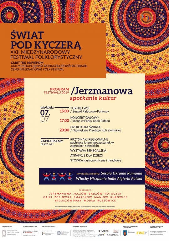 [więcej...]07 lipca 2019 zapraszamy do Jerzmanowej na teren Zespołu Pałacowo-Parkowego na Spotkanie Kultur, które odbędzie się w ramach XXII Międzynarodowego Festiwalu Folklorystycznego "Świat Pod Kyczerą" - jednego z najważniejszych wydarzeń kulturalnych realizowanych w Zagłębiu Miedziowym i na Dolnym Śląsku. Impreza posiada już ponad dwudziestoletnią historię. Start godz. 15:00. Wystąpią zespoły: Serbia, Ukraina, Rumunia, Włochy Hiszpania Indie Algieria Polska.