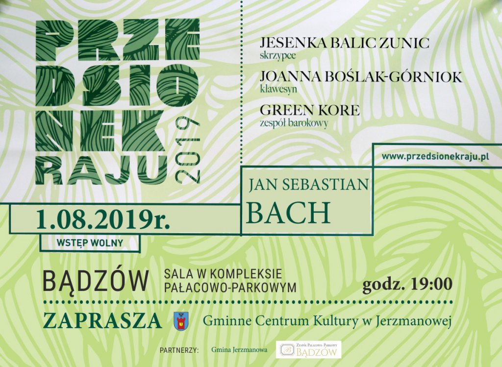 [więcej...]1 sierpnia 2019r. na godz. 19:00 serdecznie zapraszamy Państwa do sali w Zespole Pałacowo-Parkowym w Bądzowie na wyjątkową muzyczną, rajską ucztę – koncert muzyki barokowej utworów skomponowanych przez Jana Sebastiana Bacha.
