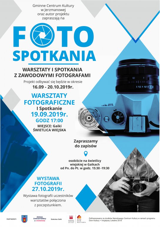 To kolejny z zwycięskich projektów realizowanych w ramach Jerzmanowskich Inicjatyw Kulturalnych w Gminie Jerzmanowa w ramach programu Dom Kultury + Inicjatywy lokalne. Projekt odbywać się będzie w okresie 16.09-20.10.2019r w miejscowości Gaiki w świetlicy wiejskiej. Zakończony zostanie wystawą fotografii uczestników warsztatów w dniu 27.10.2019 połączoną z integracja mieszkańców i poczęstunkiem.