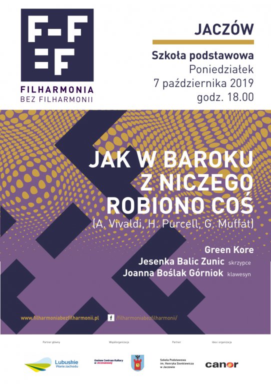Celem festiwalu jest stworzenie albo raczej odtworzenie tradycji regularnej obecności muzyki klasycznej w miejscowościach, które nie mają swoich własnych instytucji kultury muzycznej. Muzykę A. Vivaldiego, H. Purcella i G. Muffata zagrają dla Państwa zespół Green Kore, Jesenka Balic Zunic – skrzypce, Joanna Boślak Górniok – klawesyn.