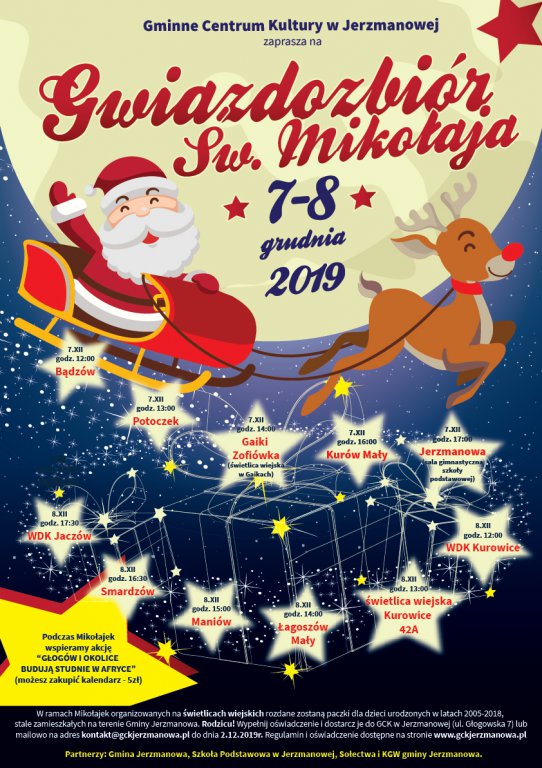 [więcej...]W tym roku Święty Mikołaj postanowił spędzić w gminie Jerzmanowa, aż dwa dni! 7 i 8 grudnia 2019r. Zapraszamy wszystkie dzieci urodzone w latach 2005-2018, stale zamieszkujące na terenie Gminy Jerzmanowa do udziału imprezie pn. Gwiazdozbiór Św. Mikołaja.