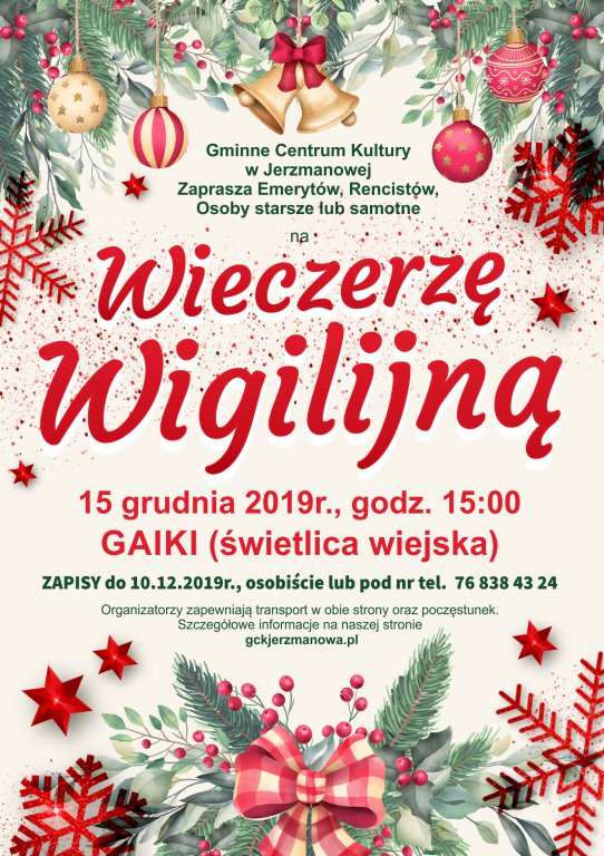 [więcej...]W ramach Wieczerzy wigilijnej dnia 15.12.2019r. w Gaikach o godz. 15:00 dla uczestników zorganizowany jest transport w obie strony. Poniżej godziny dojazdu: