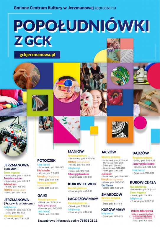 [więcej...]W nowym roku nowy rozkład zajęć. Przedstawiamy aktualny grafik warsztatów dla dzieci i dorosłych, organizowanych cyklicznie w świetlicach wiejskich. Zapraszamy na "Popołudniówki z GCK".